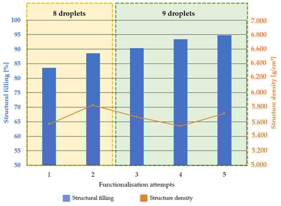 Functionalisation experiments three to five in Figure 8 (green) were carried out with a total of nine drops, while experiments one and two, framed in yellow, were carried out with a total of eight drops over the two functionalisation cycles. A maximum of 95% structural filling was achieved with nine drops. In addition to the structure filling, the density of the individual BCC structures is shown in the graph. There was a tendency that structures with a lower initial density before functionalisation showed a higher structure filling for a constant number of drops. As an example, the samples with a constant number of eight drops are considered. In the first test, a BCC structure was used, which had few adhesions and residual powder in the structure due to the process or cleaning. In addition to the structural aspects, it was therefore possible to draw conclusions about the quality of the cleaning process and the presence of SLM process-related satellite particles. The low density resulted in a high free pore volume. The eight filled droplets resulted in a low structural filling. Sample 2 is considered in comparison. In it, the mass and therefore the density increased after the SLM process and cleaning. There was less free pore volume in the structure, resulting in an apparently higher structure filling with the same number of drops. The tendencies described above could also be seen in experiments three to five with nine drops.