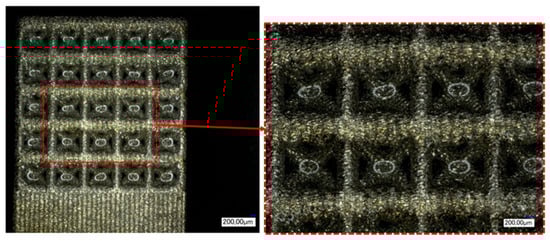 The matrix structures produced were also characterised under the optical microscope after cleaning. In addition to the ridges, the width and height of the cube and the size of the deliberately created pores were documented.