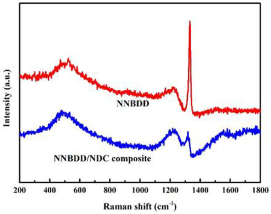 Raman spectra of the NNBDD/NDC composite films (blue line) and NNBDD films (red line).