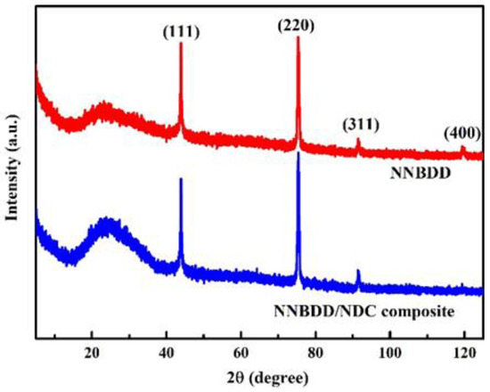 The XRD spectra of the NNBDD/NDC composite before annealing and NNBDD after annealing are presented in Figure 4. The peaks at 43.8°, 75.4°, 91.6°, and 119.4° correspond to the (111), (220), (311), and (400) diamond diffraction modes. For the polycrystalline NNBDD film, the dominant (111) and (220) peaks mean that the film mainly consists of (111) and (110) grains. The wide peaks between 20° and 40° in the XRD spectra could correspond to amorphous carbon. There is a significant amount of amorphous carbon in the NNBDD/NDC composite before annealing. The broad peak of amorphous carbon weakens after annealing. The residual broad peak might be attributed to some grain boundaries containing amorphous carbon components in NNBDD.