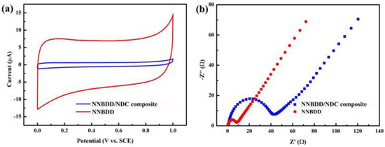 The CV tests of the NNBDD/NDC composite electrode and the NNBDD electrode in Figure 5a prove that the estimated surface area of the NNBDD electrode is 7 times that of the NNBDD/NDC composite electrode, meaning that the NNBDD structure provides more active sites for electrochemical detection. Figure 5b shows the EIS spectra that present the electron transfer kinetics of the NNBDD/NDC composite electrode and NNBDD electrode. Compared with the NNBDD/NDC composite electrode, the NNBDD has a lower charge transfer resistance, demonstrating that NNBDD has a faster charge transfer rate at the interface of the electrode and solution. The large specific surface area and better charge transfer ability of NNBDD would be beneficial for improving its electrochemical detection performance.