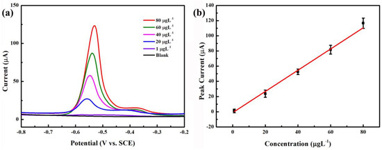 Under the pre-deposition accumulation conditions (pH = 5.0, −0.8 V, and 270 s), DPASV analysis is carried out on the NNBDD electrode using Pb2+ standard solution with different concentrations. Figure 6a shows a selection of typical DPASV curves for Pb2+ from 1 to 80 µgL−1. Within the concentration range, the stripping peak slightly shifts to a more positive potential with increasing concentration. For example, the peak DPASV potentials for 20, 40, 60, and 80 µgL−1 Pb2+ are −0.56, −0.55, −0.54, and −0.53 V, respectively. This is consistent with previous studies where the phenomenon is owed to the equilibrium reduction potential of Mn+/M increasing and the enlarged size of metal particles deposited on the NNBDD electrode surface with the increased ion concentration [37,38]. The stripping peaks obtained on the NNBDD electrode are asymmetric, which are attributed to the heterogeneously active electrode where the different graphically orientated grains are characterized by the different electrical conductivity and surface structure.
