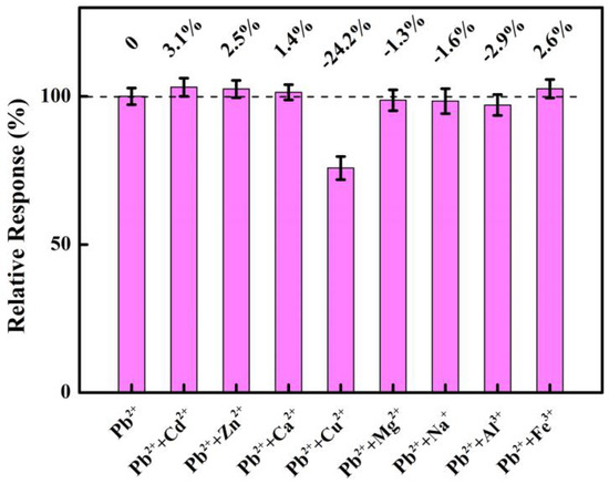 Selectivity indicates the electrode’s anti-interference capacity for performance in complicated water environments. Several interfering ions including Cd2+, Zn2+, Ca2+, Cu2+, Mg2+, Na+, Al3+, and Fe3+ are individually added to a standard solution of Pb2+ with the ten-times-higher concentration of Pb2+. As demonstrated in Figure 8, the signal of Pb2+ slightly changes when the ions of Cd2+, Zn2+, Ca2+, Mg2+, Na+, Al3+, and Fe3+ are added. This means that the NNBDD electrode has better anti-interference properties for the seven ions above, while the addition of Cu2+ produces a significant drop in the signal of detecting Pb2+. This might be attributed to the fact that Cu2+ may have a significant competitive interaction with Pb2+. Thus, Cu2+ should be pretreated in the detection of Pb2+ by the NNBDD.