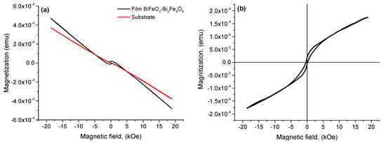 Figure 9a shows the magnetic hysteresis loops M–H of the BiFeO3-Bi2Fe4O9 composite structure, measured at room temperature in magnetic fields up to 20 kOe. Figure 9b shows the M–H loop considering the subtraction of the diamagnetic contribution of the substrate. The loop exhibits a ferromagnetic character without reaching saturation. The presence of magnetic hysteresis indicates the ferromagnetic properties of the resulting films, while the substrate exhibits diamagnetic properties.
