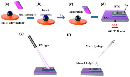 The fabrication process of the BTO films was conducted in a class 1000 clean room (see Figure 1). First, 10 g Sn is heated and melted in the heating stage at a temperature of 280 °C. Then, 1 g of Bi was added to the Sn to form a Bi-Sn alloy (Figure 1a) at a temperature of 280 °C. The formed rough oxide layer generated on the melted Bi-Sn surface was removed using a smooth glass. The smooth glass is inserted into a height-adjustable workbench and then moved in a direction parallel to the Bi-Sn alloy by applying a pushing force. Under the action of the thrust, the rough oxide layer is removed. When the rough oxide layer was removed, this sample was exposed to air for 20 s to obtain a more uniform oxide layer through a non-self-limiting oxidation reaction. Subsequently, a preheated substrate was used to touch the liquid metal for 10 s (Figure 1b). The used substrate is a p-type doped (100) crystal-oriented wafer with a SiO2 top layer of 300 nm thickness. A tweezer was used to carefully lift the substrate from liquid metals in the perpendicular direction. Since the melted Bi-Sn alloy has a lower surface energy than the SiO2 substrate, it tends to wet and adhere to the solid surface. In addition, due to van der Waals forces, the atoms and molecules on the contact area are attracted, which further contributes to the adhesion between the liquid metal and the substrate surface. Thus, a Bi-doped SnOx film was transferred to the substrate. When the substrate and the liquid metal were separated, a Bi-doped SnOx film was transferred to the substrate under van der Waals forces (Figure 1c), followed by an annealing process at 400 °C for 30 min to obtain BTO films (Figure 1d). Finally, two electrodes were mounted on the BTO thin films by an e-beams evaporation machine (TEMD 500, Beijing Technol Science Co., Ltd., Beijing, China) through a self-designed mask that retains two holes to allow the evaporated material to pass through. The used e-beam power is 20 KW, the energy is 5 MeV, and the current is 4 MA. The fabricated BTO thin films were irradiated under 5 V-biased 365 nm UV light (Figure 1e) for 20 s ~ 5 min. After the termination of the light source, 0.05 mL ethanol was dropped into the sample surface through a plastic injector (Figure 1f).