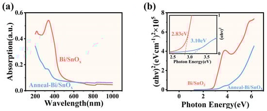 Figure 2a shows the optical absorption spectra of 2D-BTO films before and after annealing at 400 °C for 30 min in an oxygen atmosphere. After thermal treatment, the absorption edge shifts towards the lower wavelength side, which indicates the optical band gap of 2D-BTO films becomes wider. And the absorbance is reduced after annealing treatment. This is because the BTO film becomes more transparent after annealing, which involves the partial conversion of SnO to SnO2 after thermal treatment in an oxygen atmosphere [39]. In addition, Bi doping can lead to changes in the bandgap energy of SnO2 when annealing, which reduces the absorbance of the prepared BTO thin films. The was depicted in Figure 2b. The optical band gap of 2.78 eV of as-prepared BTO films was obtained by linearly extrapolating towards zero absorption. The band gap is consistent with the reported values of SnO [40], which further illustrates that dominant oxides are SnO in the as-prepared BTO films. After annealing, the optical band gap increases to 3.10 eV, which is close to the reported values of SnO2 films [41]. The optical band gap increasing after the annealing of BTO films can be partially attributed to the crystal structure changes, since the annealing process causes the atoms in the BTO film to rearrange, forming a more ordered and perfect crystal lattice. This increased order causes changes in the material’s electronic structure, affecting its band gap. On the other hand, Bi doping and annealing can help reduce defects and vacancies in the crystal lattice, which can introduce energy levels within the band gap. Fewer defects mean a more uniform and well-defined energy band structure, which can result in a larger band gap.