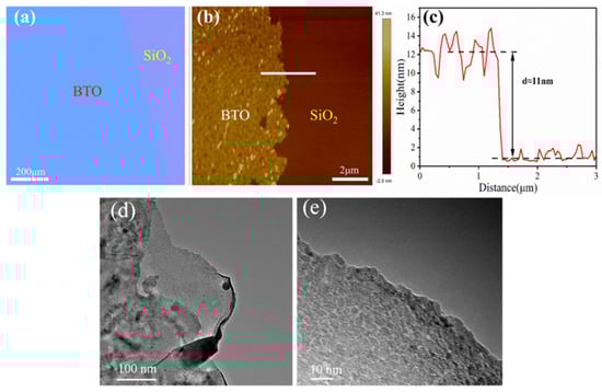 Figure 3 shows the morphology and thickness of the fabricated quasi-2D-BTO films. The morphology was observed at 20× magnification of a metallurgical microscope, where the colors of the SiO2 substrate and the 2D-BTO film are purple and blue, respectively (Figure 3a). It can be seen that good uniformity is obtained in the prepared BTO film, and an average thickness of ~11 nm was realized for the BTO film (Figure 3c). In TEM images (Figure 3d,e), there are some regions where the BTO film and substrate boundaries are closely connected and some regions where cracks are observed at the boundary between the BTO film and the substrate. The occurrence of these cracks can be ascribed to the differing thermal expansion coefficients of the thin films and substrates, resulting in varying rates of expansion and, consequently, inducing stress and cracking. In addition, BTO thin film exhibits greater roughness compared to the Si substrate. This phenomenon can be attributed to the annealing process, specifically the temperature and duration to which the film is subjected. During the annealing process, the BTO thin film may undergo various surface imperfections, such as wrinkling, cracking, or increased roughness due to the induced strain and stress.
