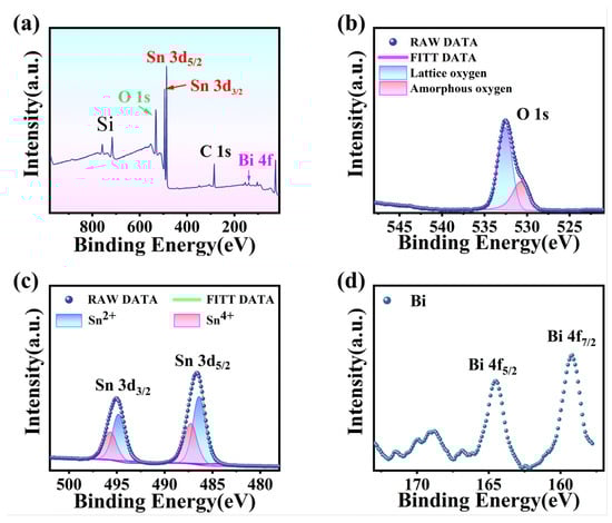 The X-ray photoelectron spectroscopy of the BTO films is presented in Figure 4. The element peaks of Sn, O, and Bi can be observed, and the atomic percentages of Sn, O, and Bi are 29.2%, 70.7%, and 0.1%, respectively. The Bi element was measured to be less than 0.2%, which can be interpreted as the Gibbs free energy (ΔGf) of BiO2 is lower than that of SnO2 [42]. According to the laws of thermodynamics, the metal oxide (SnO2) with the largest ΔGf will cover the surface of the Bi-Sn alloy, and only a small amount of the metal oxide (BiO2) will be precipitated due to a lower ΔGf. The high-resolution XPS spectrum of O1s is fitted by the amorphous oxygen at 532.52 eV and the lattice oxygen at 530.58 eV. The amorphous lattice oxygen peak is much higher than that of lattice oxygen can be partially attributed to the large amount of oxygen adsorption on the surface of the 2D-BTO film. In addition, the amorphous lattice oxygen peak may partially come from the amorphous SiO2 substrate since its oxygen atoms are not arranged in regular, repeating crystal lattices. This lack of long-range order can lead to differences in the binding energy of the oxygen atoms and result in distinct peaks in the XPS spectrum. The peaks at 164.52 eV and 159.18 eV correspond to Bi 4f5/2 and Bi 4f7/2 of BixSn1−xO2, respectively, which means that the bismuth element in the film is Bi3+. The Sn 3d3/2 and 3d5/2 peaks were located at 495.08 eV and 486.68 eV, respectively. The two Sn 3d peaks can be further fitted by the Sn2+ peak centered at 494.8 eV and 486.3 eV, and the Sn4+ peaks centered at 495.6 eV and 487.3 eV, respectively. This evidence further demonstrated the existence of both SnO and SnO2 in the resultant BTO films.
