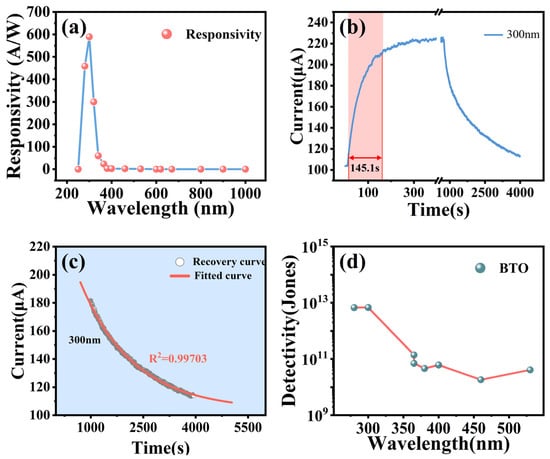 (a) Responsivity of annealed quasi-2D-BTO films to different wavelengths of light at 5 V bias, (b) photocurrent variation and response time of BTO films illuminated by 300 nm UV light with a power density of 45.5 μW/cm2, (c) recovery time function fitting of BTO films under 300 nm UV illumination, (d) detectivity (D*) of photodetectors based on BTO films.