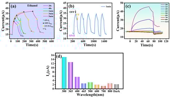 Figure 6 shows the photocurrent changes of the prepared 2D-BTO film with and without dripping of ethanol. Ethanol was added 1 min later after light off. In Figure 6a, the photocurrent was measured at different illumination times using 365 nm UV light at a temperature of 40 °C. ON-IS represents the photocurrent without illumination, OFF-max shows the maximum photocurrent before the termination of the light source, ET IN-Imin represents the photocurrent when ethanol starts to drop, and IE is the final current. It can be seen that the photocurrent increases as the irradiation time increases and the maximum photocurrent reaches approximately 36.9 μA when the irradiation time reaches 5 min. After the light off, the photocurrent slowly decreases following a slow drop mode (IMax~Is). When introducing the ethanol steam to the photodetector, the photocurrent drops dramatically, and finally levels off. Herein, I∆ is introduced, which represents the difference between the IS and IE, as follows