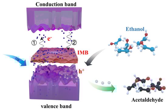 Figure 7 illustrates the energy level and the reaction mechanism between the 2D-BTO film and ethanol. Under the excitation of UV light, the electrons in the 2D-BTO film are initially excited from the valence band to the conduction band (①). The existence of an intermediate band (IMB) originating from defects/impurities-related deep level can store photoelectrons from the conduction band otherwise directly recombine with the photoholes in the valence band, i.e., the photoelectrons are captured by the intermediate energy level (②), and then slowly jump to the valence band, resulting in a large number of photoholes residing in the valence band that cannot be consumed immediately. When the ethanol droplet contacts with the 2D-BTO, the “dark” photocatalysis process will take place, and the unrecombined photoholes will oxidize ethanol molecular to acetaldehyde, and the photoholes are consumed rapidly by oxidizing the ethanol to acetaldehyde with high reductive property [44]. Furthermore, the photoelectrons can be depleted by reacting with adsorbed O2 on the surface of the produced H+ from the photohole oxidation reaction. In addition, the photogenerated electrons separated in the conduction band diffuse to the surface of 2D-BTO can form a strong reduction potential with strong reducing properties to react with oxidizing substances such as CO2 to form CO, CH4, and other substances [49]. Photogenerated electrons can also reduce the oxygen on the surface of the polymer film to superoxide radical ·O2−. And ·O2− undergoes a series of reactions to produce ·OH radicals, thus degrading organic matter [50].