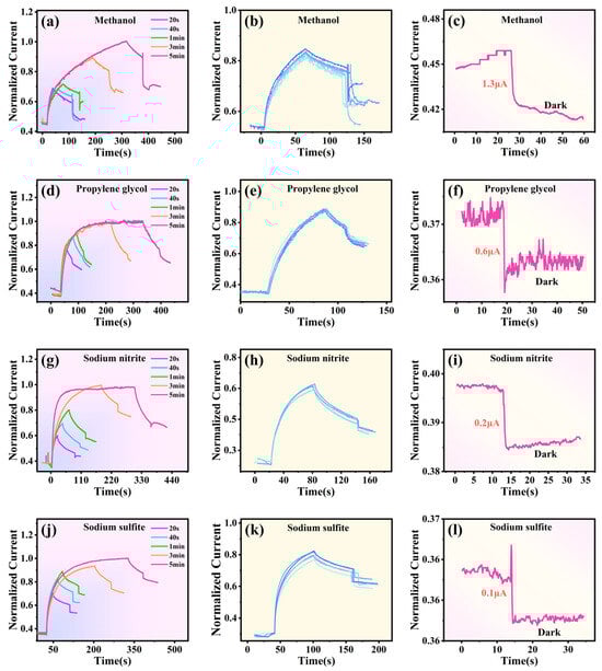 (a,d,g,j) Current changes of BTO thin film before and after adding methanol, propylene glycol, Na2SO3, and NaNO2 under different UV exposure times; (b,e,h,k) repeat current curves of dropping methanol, propylene glycol, Na2SO3, and NaNO2; (c,f,i,l) dark current changes of BTO thin film after adding methanol, propylene glycol, Na2SO3, and NaNO2.
