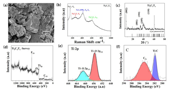 (a) SEM image; (b) Raman Spectrum; (c) XRD; and (d–f) XPS of Ti3C2Tx.