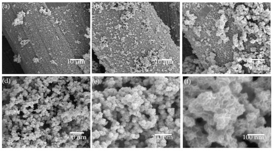 MoSe2@Ti3C2Tx was successfully synthesized on the Carbon Clothes with a facile one-step hydrothermal. During the preparation of the samples, the Ti3C2Tx played a key role, and SEM was used to observe the influence of the Ti3C2Tx on the surface morphology features of the synthesized samples. As shown in Figure 3a–c, with the increase of Ti3C2Tx content, more and more MoSe2 became attached to the carbon cloth substrate. This may be due to the intense attraction between terminal groups (-F, -OH, -O) on Ti3C2Tx and carbon fiber cloth substrate. However, the surface of MoSe2@4 Mg Ti3C2Tx had the most evenly distributed MoSe2 nanoflowers. A high-magnification scanning electron microscope was used to analyze its surface morphology further to study the MoSe2@4 Mg Ti3C2Tx. High-magnification scanning microscope photographs of MoSe2 nanoflowers are shown in Figure 3d–f. The size distribution of a single nanoflower was between 30 and 60 nm.