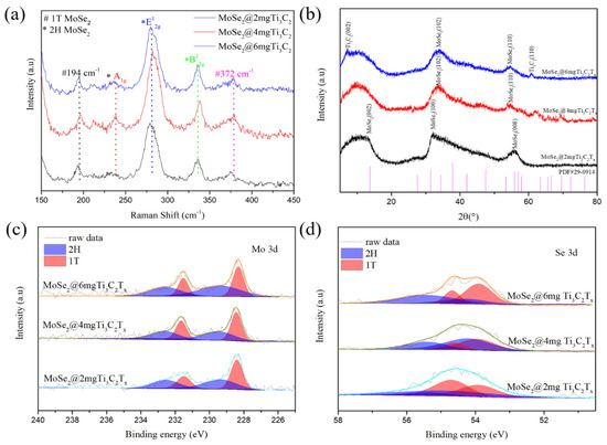 MoSe2 synthesized with different Ti3C2Tx-added amounts; (a) Raman spectrometer shifts; (b) XRD pattern; (c) Mo 3d XPS spectra; and (d) Se 3d XPS spectra.