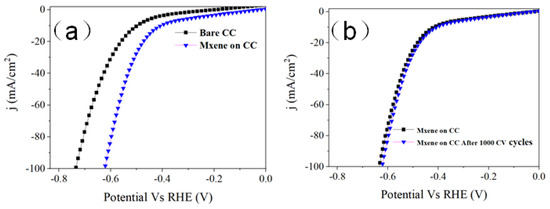 (a) LSV of Bare CC and MXene on CC; (b) LSV of MXene on CC and MXene on CC after 1000 CV cycles.