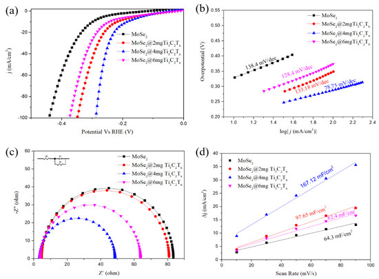 Electrochemical properties of MoSe2@ Ti3C2Tx synthesized with diverse amount of Ti3C2Tx. (a) Polarization curves after IR calibration; (b) corresponding Tafel plots of the samples stemming from (a); (c) Nyquist plots of the samples; and (d) Cdl current at different scan rates.