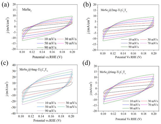 CV scanning curve in the scanning range of 0.1 V–0.2 V for different samples of (a) MoSe2, (b) MoSe2@2 mg-Ti3C2Tx, (c) MoSe2@4 mg-Ti3C2Tx, and (d) MoSe2@6 mg-Ti3C2Tx.