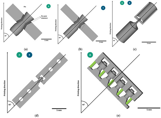 The pin-joints had edged concave-shaped holes and edged convex-shaped pins. The edging of the geometrical shape simplified the model and reduced the number of different angles within each joint for downscaling purposes. Figure 1 depicts the two miniaturized pin-joints (A and B) and their deduced testing specimens (c, d and e). The bigger variant of the miniaturized pin-joints, pin-joint A (a), had the same geometry as the pin-joints integrated in a pantographic metamaterial with a constant clearance of 120 µm in a previous study by Gutmann et al. [20]. Pin-joint B (b) was a further realized miniaturization of pin-joint A by approximately 33%. The diameter of the pin was reduced from 0.56–1 mm to 0.32–0.66 mm, and accordingly, the beam’s thickness was equal to the maximal value of the pin’s diameter. Thereby, the most acute angle of the overhanging surfaces of the non-assembly pin-joints was 27.5°.