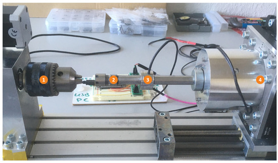 The torsion analysis was conducted on an adapted testing device adapted from Trippel et al. [21] that is suitable to measure torque values relevant for small rotational joints and therefore suitable to test the miniaturized pin-joints of this work. The adapted torsion setup is illustrated in Figure 2. The fixed drive (1) of the device was original. The following adaptations were changes made compared to the published device. The drill chuck was exchanged with a (2) straight milling extension ER11 with dimensions: D:12, L:140 (Gedema® GmbH, Hagen, Germany), and a (3) pressure sensor KM26z 500 N (ME-Meßsysteme GmbH, Henningsdorf, Germany) was added to the extension rod. These changes allowed the measurement of the force applied along the pin-joint axis during torsion and while mounting a specimen into the setup. This way, the axial loading could be adjusted while fastening the specimens to the device. Strong forces that might damage the pin-joint could be avoided, and the axial force could be zeroed before the torque measurement was started. Furthermore, the (4) torque sensor was exchanged with a TD70 ±1 Nm/VA torque sensor (ME-Meßsysteme GmbH, Henningsdorf, Germany).