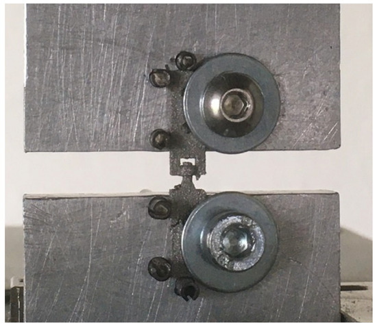 For the tensile testing, the specimens were pulled using a Zwick RetroLine testing machine (ZwickRoell AG, Ulm, Germany) in displacement control mode. The tests were conducted until failure with a velocity of 2 mm/min. Because of their size, the specimens were mounted on specially manufactured platforms, as shown in Figure 3, which were clamped with screw grips. This allowed easier access to insert and remove the specimen. Furthermore, this prevented strong forces from tightening the screw grips, which may have damaged and destroyed the miniaturized pin-joints.