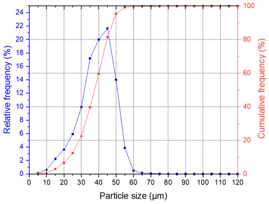 The particle size analysis of the Ti6Al4V powder showed a cumulative particle size distribution of D10: 23.27 µm, D50: 37.64 µm, and D90: 47.65 µm; the full measurement is illustrated in Figure 4. The particle shape analysis calculated a width/length ratio (aspect ratio) b/l3 of 0.869 and a specific surface area Sv of 180.06 mm. From the area-to-perimeter ratio, a mean sphericity SPHT3 of 0.872 was calculated; for a perfect sphere, this value was equal to 1.
