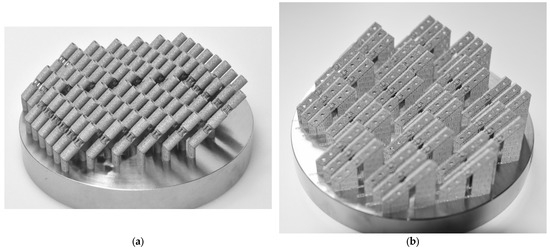 As-built manufactured specimens with support structures on Ø 100 mm build plates: (a) torsion specimens; (b) tensile specimens.