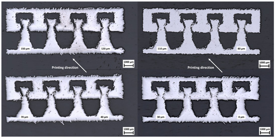 The metallographic sections are shown in Figure 6. Edge rounding was observed on three images of the sections, which was due to multiple grinding steps to reach the median plane (the green-marked plane in Figure 1e). In this plane, the deviations of overhanging surfaces from the CAD model were the largest, and the difference in joint clearance in regard to the angle of the surfaces to the printing direction became evident. The more acute the angle of a surface to the build plate (orthogonal to the building direction) was, the bigger the deviations were. Overall, the joint clearance became more defined with increasing nominal clearance size, but an overlapping of the pin with the surrounding material could be observed even in the 150 µm joint clearance specimen. Though the amount of overlapping and the area of clear material fusion increased with decreasing joint clearance up to a rigid body for the 0 µm joint clearance variant, the joint clearances for 10 µm to 30 µm looked more like an accumulation of pores along the nominal clearance compared to higher clearance values where the pin could be recognized as a separate structure. From this presented view alone, it was difficult to judge which pin-joint would function as an actual joint, so mechanical investigation was necessary. Given these images and the particle size distribution of the powder used for manufacturing, the authors expected a functional pin-joint with at least a joint clearance of more than 40 µm and potential forces needed to break loose local fusions or overlapping of material. Furthermore, a functional pin-joint without needing local forces to break the pin loose was expected, starting with a joint clearance of 70 µm, which is bigger than the size of the majority of particles measured.
