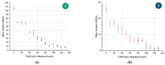 To analyze the functionality of the joints, torsion tests were performed on the pin-joints with varying nominal joint clearances. If a sample group of three specimens with the same clearance showed differing functionality (functional and breaking) during torsion, the size of the sample group was doubled. In Figure 7, the maximal torque in relation to the two pin-joints and their joint clearance is illustrated. Thereby, functional joints are marked black, and broken joints are marked red. It was observed that a torque of approximately 29 mNm for pin-joint A and approximately 6 mNm for pin-joint B could be considered a threshold between the pin breaking due to torsion and the pin being able to break free of local fusions without breaking. To put these values into perspective, the contact between the inner and outer cylindrical surfaces of conventional pin-joints by assembly without any load is usually assumed to be frictionless, and therefore any torque can be considered an imperfection.