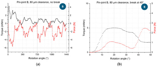 Selected torque-rotation-angle curves of pin-joint B specimens with an 80 µm joint clearance: (a) full measurement of torque and axial force of 4 full rotations without the specimen breaking; (b) measurement of torque and axial force of a specimen with the same nominal joint clearance that breaks at approximately 40°. Thereby, the force was measured simultaneously to the torque along the axis of the pin and therefore along the milling extension of the setup, as featured in Figure 2.
