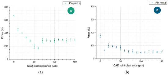 The maximal axial force is averaged over a set of three individual experiments. The error bars denote the standard deviation. (a) shows the results of the tensile specimens with pin-joint A, and (b) shows the results of the pin-joint B variants, respectively. In ()* two of the three 150 µm specimens, the multibody separated without the pins breaking.