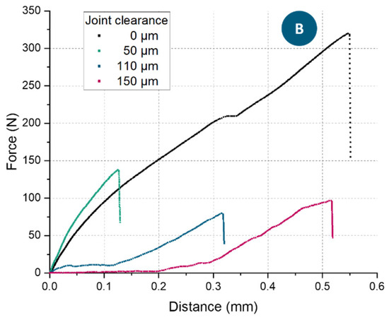 In addition to the measured data of the maximal loading capacity of the pin-joints, selected force-displacement curves of these tensile tests with pin-joint B are illustrated in Figure 10. The curve of the rigid joint, compared to the other curves, displayed the expected higher loading capacity until breakage of a bigger tensile sample. By contrast, the curve of the 50 µm clearance specimen exhibited drastically different features. The maximal force was reduced by more than half compared to the rigid joint, and the travel distance quartered its value. This can be explained by the manufacturing size effect; the correlation of pore volume to surface-to-volume ratio of microbeams, described by Yin et al. [26]; and the mechanical change of a tensile test of a single body to that of a multibody system, introducing friction, abrasion and potential transverse forces due to rough surfaces interacting. Thereby, the rough surface can lead to the multibody interlocking at a slight angle to the pin’s axis, introducing potential transverse forces. It is also possible that the rough surfaces temporarily interlock until some abrasion on either of the bodies happens. With increasing joint clearance, starting at 90 µm, a plateau in the force measurement was observed. This plateau in the force is explained by the size of the joint clearance and represents the distance needed for the two bodies to become fully in contact. Therefore, the appearance of this plateau in the force-displacement curve can be considered an affirmation of a functional pin-joint.