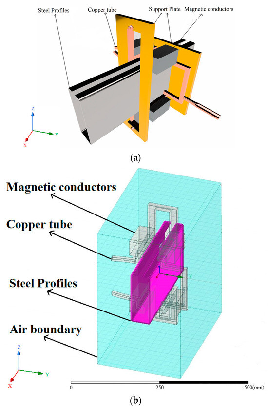 As is shown in Figure 4a, during the induction heating process, when the sharp-edged steel is close to the induction coil, the magnetic field inside the induction coil will induce a current within the steel section. According to Lenz’s law, these induced currents will generate a magnetic field inside the conductor, which interacts with the magnetic field of the induction coil. On the surface of the steel section, due to the distribution of the current within the conductor, areas with a higher current density typically form. The path of the induced current within the steel section aims to minimize the magnetic reluctance between the induction coil and the steel section, thereby concentrating the current more on the surface of the steel [50].
