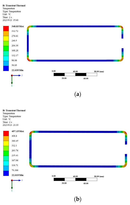 The induction heating frequency was 40 kHz, and the heating current was 3000 A. The magnetic field intensity distribution with a heating time of 2 s is shown in Figure 4, where Figure 4a is the result diagram of the model without a magnetic core and Figure 4b is the result diagram of the model with a magnetic core. The relative permeability of the magnetic conductor is much higher than that of air, copper pipe, and steel, which greatly reduces the magnetic resistance of the area where it is located. Furthermore, it can “attract” the magnetic induction lines originally freely spread in the air domain to the body, so that the magnetic induction lines can be passed through the body, greatly increasing the magnetic flux in the body. By controlling the opening position, it can guide the high-density magnetic induction lines in the body to the heating area to be heated. Then, by controlling the opening position, the high-density magnetic lines in the body are directed to the heating area. Using the same simulation parameters, the ability of the conductor to control the spatial distribution of the magnetic lines and the significant increase in flux in the local area can be clearly seen.