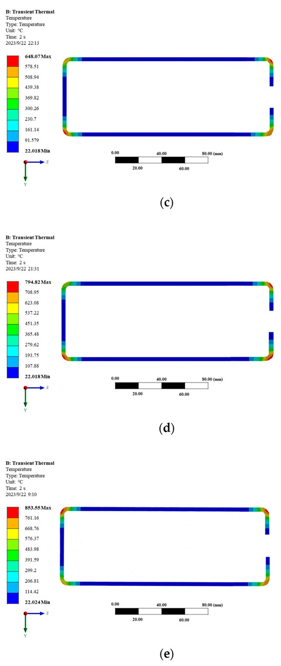As is shown in Figure 4b, when an L-shaped magnetic flux field concentrator is added around the induction coil, as current flows through the induction coil, the concentrator directs the magnetic field to the slot end, resulting in a higher magnetic field strength near the slot end. At this time, the current will also be more concentrated near the slot end [42]. The presence of the magnetic flux field concentrator can enhance the efficiency of the induction coil by increasing the current density within the coil. It can improve the efficiency of the induction heating system, achieving faster heating speeds and higher energy utilization rates [51].