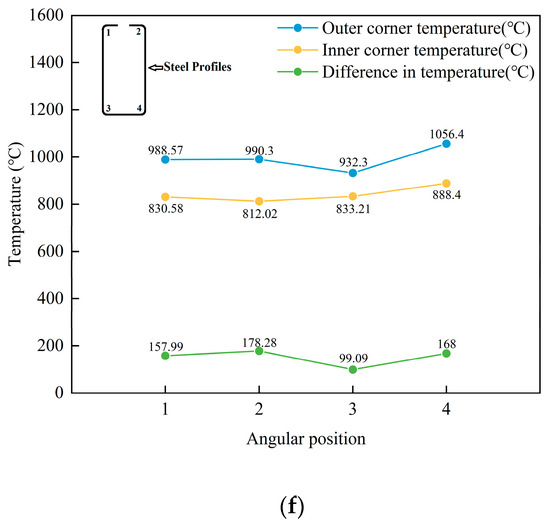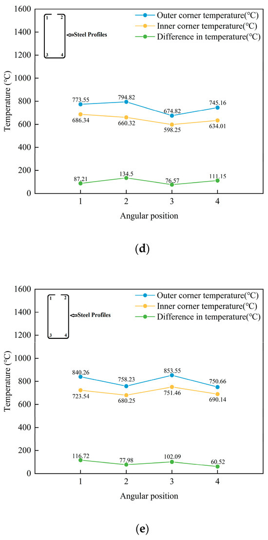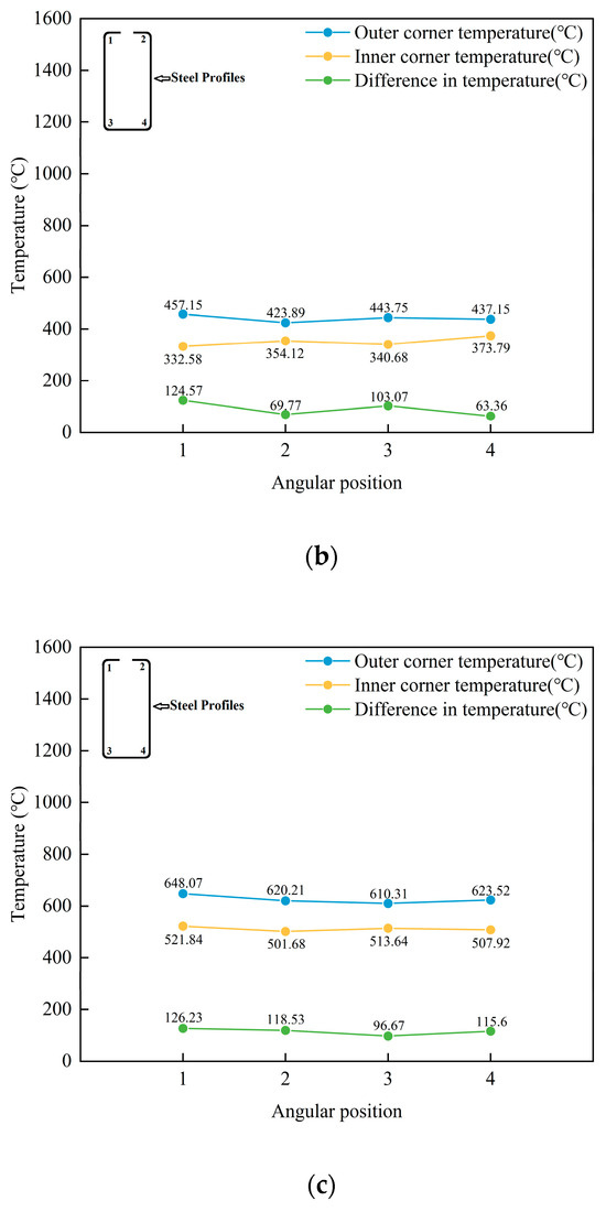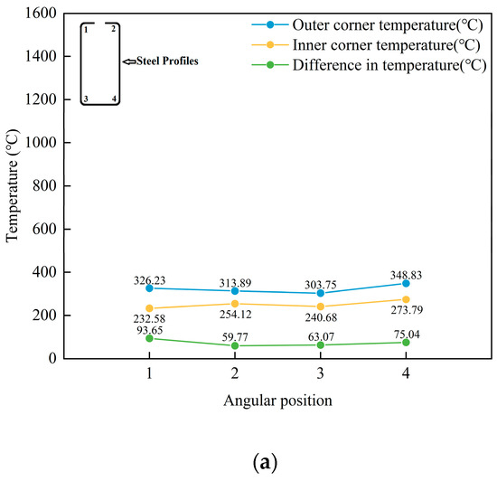 Due to the symmetry of the coil, we only considered the infrared thermal imager temperature measurement results and numerical simulation results for corners 1 and 2 of the sharp-edged steel. The heating temperature obtained from the numerical simulation at corners 1 and 2 of the steel section was higher than the actual measurement results, as shown in Figure 11. As the actual measurement values are affected by the heat loss at the outer corner of the steel section, the thermal properties of the material play a crucial role in temperature variations. A constant surface heat transfer coefficient was used in the model. However, in reality, heat dissipates, leading to actual temperatures being lower than those from numerical simulations.