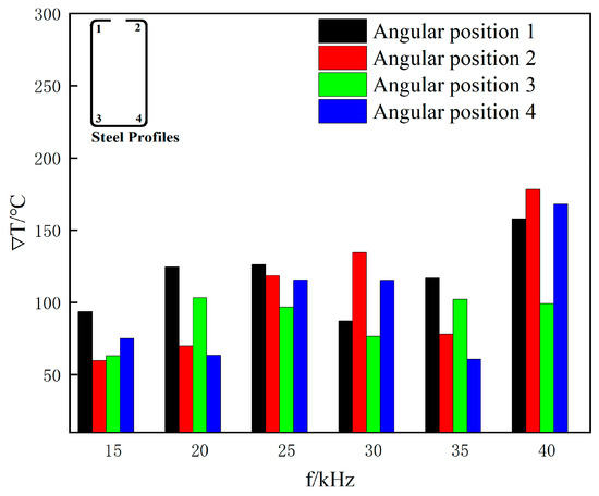 Figure 6 displays the temperature curves of the outer corner and inner corner and the temperature difference in the corner after heating with an input current of 3000 A and different current frequencies of 15 kHz, 20 kHz, 25 kHz, 30 kHz, 35 kHz, and 40 kHz, with a heating time of 2 s.