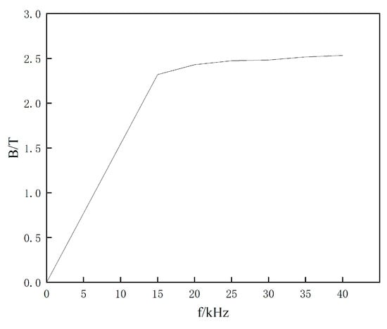 The results shown in Figure 6 indicate that during induction heating, as the heating frequency increases, eddy currents are generated at shallower positions from the surface, leading to a shift in the peak magnetic induction intensity towards the outer corner surface [56]. In a high-frequency alternating magnetic field, the current flows more concentratedly through the conductor’s surface, while the current power in the middle of the material gradually decreases [57]. With the increase in frequency, the generation of eddy currents is affected by the internal resistance of the material, causing the current to be mainly concentrated on the surface, and the current generated in the middle of the material is minor. The skin effect is a significant factor causing the peak magnetic induction intensity to shift towards the outer corner surface. During induction heating, the skin effect [58] means that a high-frequency alternating magnetic field will cause eddy currents on the material’s texture, generating heat. However, when the surface temperature of the material rises above its Curie point, the magnetism of the material changes, transitioning from its original magnetic state to a non-magnetic or weakly magnetic state. This phenomenon affects the efficiency and depth of induction heating.