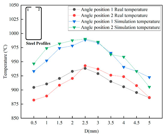 When using a heating frequency of 40 kHz and a current of 3000 A, we found that the relative errors between the simulated and measured temperatures at the highest temperature data points for corners 1 and 2 of the sharp-edged steel were 5.37% and 5.02%, respectively. The results indicate that the thermal properties of the sharp-edged steel are more appropriate under high-temperature conditions. Moreover, the finite element model has a particular capability in terms of prediction and is consistent with the actual situation.