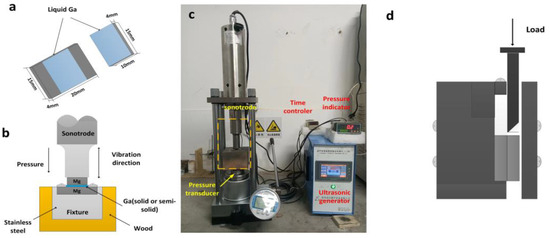 Schematic diagram of experimental process: (a) Mg base metals after painting liquid Ga; (b) sketch of joining configuration; (c) schematic diagram of ultrasonic system; (d) cross-sectional diagram of shear test.