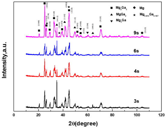 In the sample with an ultrasonic duration of 3 s, the diffraction peak of H-MgGa2 at (0 1 2) was the highest, and no peak of Ga appeared, which implied that the solder was consumed at 3 s. However, at 4 s, the peak of Mg2Ga5 at (0 0 2) was the highest. At 6 s, the peak of H-MgGa2 at (0 1 2) was the highest again, and the peak of Mg2Ga5 at (0 0 2) declined, which suggested that there was an increase in H-MgGa2 after an ultrasonic duration of 6 s. At 9 s, the peak of H-MgGa2 declined and that of Mg2Ga5 became the highest. The variations in the XRD peaks suggested that the compositions of the IMCs underwent some changes with increases in the ultrasonic duration. It is also noteworthy that the shape of the diffraction patterns changed at different times, indicating the existence of a crystallographic texture.