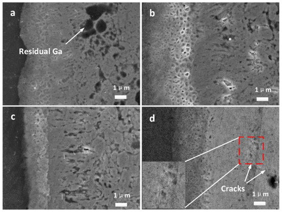 When the ultrasonic duration was prolonged to 6 s, the amount of H-MgGa2 increased, as shown by the XRD patterns. As shown in Figure 4c, the columnar morphology of H-MgGa2 was discovered in more areas and became clearer, while the central grains of IMCs existed in elliptical and spherical shapes. There were obvious micro-seams between the columnar layers and the gathered bulks. When ultrasound was applied for 9 s, as shown in Figure 4d, the columnar morphology and large blocks no longer appeared in the joint. The voids and porosity also disappeared, and the structure of the entire joint was refined and homogenized.