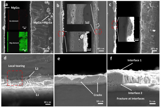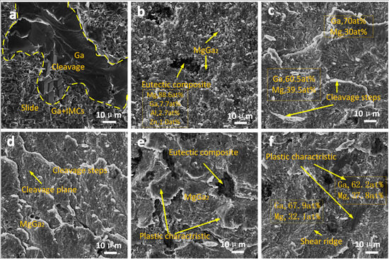 Figure 5a shows the phenomenon of the tearing of the top-side base metal after the shear test. This resulted from the local plastic deformation caused by ultrasonic vibration. Xie et al. suggested that plastic mismatch happens between metals and oxide film, which contributes to the breakage of oxide films; then, fresh metal and the filler touch, atoms diffuse, and a eutectic liquid forms [7]. Additionally, Somekawa investigated the superplasticity of magnesium under the action of ultrasound [27]. These studies indicate the possibility that local plastic deformation occurs at the interface during ultrasound. However, the specific location of the fracture was difficult to visually distinguish because of the rheological phenomenon caused by large-scale tearing. From the elemental distribution diagrams, it was determined that fractures mainly occurred in the IMC layers with more Ga, namely, the areas in which Mg2Ga5 and H-MgGa2 were aggregated, with some fractures occurring in the eutectic area. Figure 5b shows an SEM image of the fracture location in a joint with a shear strength of only 4 MPa. The fractures mainly occurred in the central Mg2Ga5-rich region, which was where cavities were distributed, or at the interface between the Mg2Ga5-rich layer and the columnar H-MgGa2 layer, which resulted in a relatively flat fracture morphology. When fractures penetrated more H-MgGa2-rich and eutectic areas, as shown in Figure 5c, tearing also occurred. There was an extremely rough fracture plane because of the wave-like fracture path. In Figure 5d, which shows the local rheological phenomenon, it can be seen that both the IMC layer near the base metal and the eutectic layer experienced tearing. This implied that the IMCs in these regions presented ductile characteristics. As shown in Figure 5f, the interfaces between regions with different crystal structures, such as the columnar layer and eutectic layer, were easily attacked. The amplified view of the fracture location in Figure 5e shows that cracks were still distributed in the IMC layers but stopped before they propagated to the eutectic layer. This phenomenon occurred in almost all fracture samples. Therefore, it could be hypothesized that the cracks could pass through the central IMC layer more easily because of the distribution of cavities. Additionally, the interfaces between two different layers were also options for cracks. However, the existence of the columnar and eutectic layers was instrumental in resisting crack propagation.
