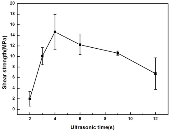 - The shear strength of the joints increased with durations from 2 s to 4 s and then steadily decreased from 4 s to 12 s, and the highest shear strength of 14.65 MPa was obtained after ultrasonic treatment for 4 s. Brittle fractures occurred, and the morphology expressed the typical characteristics of cleavage fracture and some plastic characteristics with the extension of the ultrasonic duration.