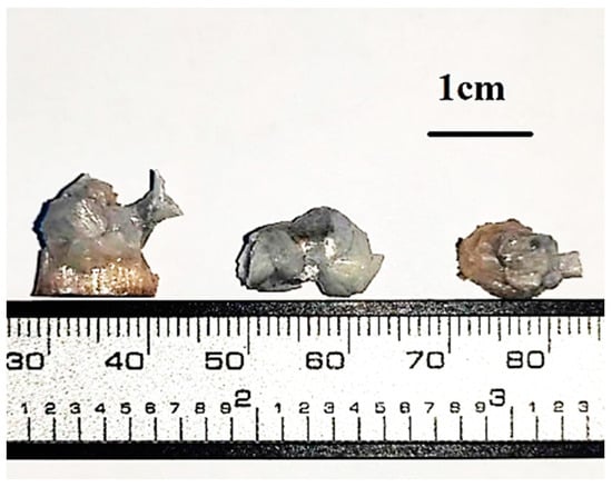 β-Ga2O3 crystals were synthesized via irradiation of the initial β-Ga2O3 powder with 99.999% purity using a powerful electron beam generated by an ELV-6M electron accelerator [36]. The powder was placed in a copper crucible with recess of 5 mm. As a result of irradiation, the powder sample fused, forming small irregularly shaped ceramics with linear dimensions of about 1 cm (Figure 1). The energy of accelerated electrons was 1.4 MeV. The power of the accelerated electron flux was ~25 kW/cm2, and the total irradiation time was 36 s. The resulting ceramic pieces were cooled to room temperature, divided into several parts, and examined. After structural and spectral investigations, the test sample was then annealed in air for 6 h at 1000 °C and the properties of the annealed sample were re-examined.