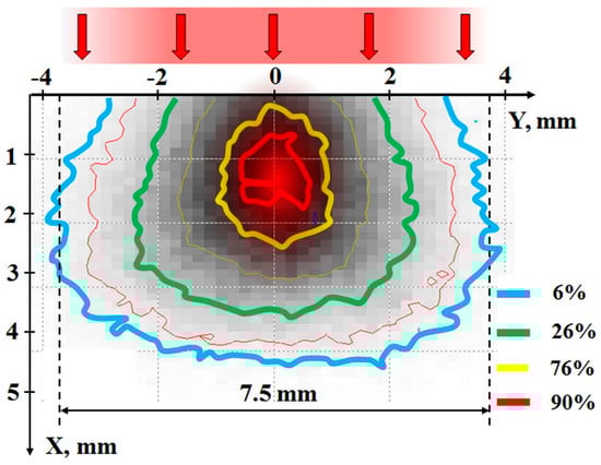 In order to study the development of the melting process under the influence of an electron beam, we undertook a comprehensive numerical simulation to explore electron energy losses when passing through Ga2O3 powder using the advanced Casino v2.51 code [38]. This simulation was achieved through the Monte Carlo methods. We set the following parameters: electron energy 1.4 MeV, beam diameter 7.5 mm, and Ga2O3 powder bulk density 1.5 g/cm3. Our exhaustive calculations were based on the passage of a substantial count of 10,000 electrons through the Ga2O3 powder, and the consequential data are graphically illustrated in Figure 2. In our experimental design, the synthesis was instigated by subjecting a blend of powders to an electron beam.