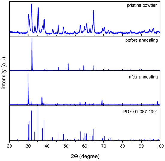 Figure 3 shows the XRD patterns of the synthesized β-Ga2O3 ceramic before and after annealing in comparison with ICSD pattern (PDF-01-0871901) [40], respectively. The diffraction patterns of the synthesized β-Ga2O3 ceramics before and after annealing (Figure 3) have a good comparison with the reference diagram, which indicates that the obtained samples correspond to the monoclinic structure of the space group C2/m. It can be assumed that a sharp local increase in temperature during irradiation using a powerful electron beam leads to remains of deformations and distortions of the crystal structure formed during powder sintering. In this case, the most pronounced distortion of the crystal lattice is observed along the a and b axes, for which the deviation from the reference values is more than 1% (Table 1 and Table 2). Indeed, the observed slight deviation of the crystal lattice parameters from their reference values, as well as the smaller unit cell volume compared to the reference unit cell, indicates distortions of the crystal lattice which can be attributed to the “detonation” nature of the initial powder sintering. Subsequent annealing causes the diffraction peaks to slightly shift towards lower values of the Bragg angle, which indicates an increase in the lattice parameters and unit cell volume, improving the convergence with the reference values, increasing the crystallinity of the lattice, and decreasing the crystallite size. Thus, annealing leads to the removal of residual stresses and distortions in the lattice, preserved as a result of rapid sintering of the β-Ga2O3 powder (Table 1 and Figure 3). Note that the degree of sample crystallinity has estimated the ratio of the integrated intensity of the reflections to the total X-ray intensity.
