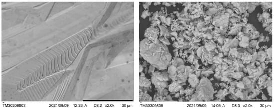 The used apparatus made it possible to observe volumetric samples with shadow and volumetric contrast with a resolution of up to 30 nm. Figure 4 shows typical SEM images of the synthesized β-Ga2O3 ceramic surfaces with an area of ~0.016 mm2 (a) and powdered sample (b), magnified by 1000 times. Evidently, the resulting ceramics have a monolithic surface structure, which indicates the complete disappearance of powder particles or any other imperfections with formation of a solid phase. The original gallium oxide powder consists of particles ranging in size from 1 to 15 µm (Figure 4, right).