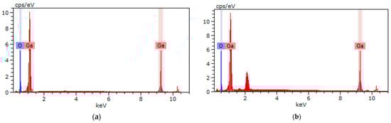 The study of the atomic structure of the resulting ceramics was carried out on a D8 ADVANCE ECO diffractometer. Diffractograms were built in the range of angles 2θ: 20–110° with a step of 0.02° (Figure 2). The quantitative ratio of the phases was determined in the TOPAS 4.2 program. The surface state of the synthesized ceramic samples was studied using a Hitachi TM3030 scanning electron microscope (Hitachi High-Technologies Corporation, Tokyo, Japan) with a Bruker XFlash MIN SVE energy dispersive analysis system (energy-dispersive spectroscopy, EDS) (Bruker, Billerica, MA, USA) at an accelerating voltage of 15 kV, which was used to analyze the composition of β-Ga2O3. In order to analyze the electronic and optical properties of the resulting ceramics, we measured the excitation and PL emission spectra of the obtained samples in the wavelength range from 200 to 800 nm on a CM-2203 spectrofluorimeter (Solar, Minsk, Belarus) at room temperature (RT). Raman spectra were recorded using Horiba Jobin–Yvon LabRam HR800 (Horiba Jobin Yvon, Longjumeau, France). To evaluate the obtained data, we compared the obtained results with the same results that have been received on commercial unintentional doped (UID) crystals of β-Ga2O3 with orientation (−201) from Tamura Corp. (Tokyo, Japan) [37].