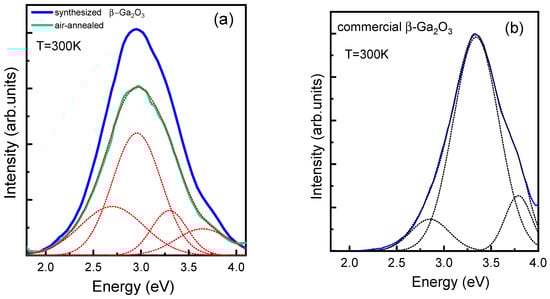 The photoluminescence spectra of the synthesized ceramics and commercial crystals upon excitation with an energy of 4.9 eV are shown in Figure 6a,b. Through Gaussian approximation, we found three components with peaks corresponding to blue (~2.7 eV) and UV (3.3, 3.4, 3.8 eV) luminescence (Figure 6a). It can be seen that the spectra measured for synthesized ceramics and commercial crystals are quite similar. The main difference between spectra is that the position of a luminescence peak of synthesized ceramics exhibits in a lower energy range of around 3 eV (Figure 6a). The latter indicates the presence of distortions and defects in the crystal structure, which cause the deviation of the electronic properties from the electronic properties of commercial crystals. After annealing, the concentration of defects reduces, improving crystal quality and causing a decrease in the luminescence intensity of ~27% (Figure 6a). The downward trend in intensity after annealing is also confirmed in studies of β-Ga2O3 crystals obtained via edge-defined film-fed growth (EFG) [41], as well as in the study of a variety of YAG:Ce, YAG:Gd, and Ce ceramics [34]. Intensity decreasing can be ascribed to two possible reasons: a decrease in the concentration of oxygen vacancies (VO), as well as the capture of electrons involved in luminescence in traps (for instance, in Ga atoms). Also, during annealing, impurities with a low migration barrier, such as hydrogen [43], can leave the crystal. As shown by recent calculations, hydrogen in β-Ga2O3 is a shallow donor [43,44] and can participate in luminescence processes.